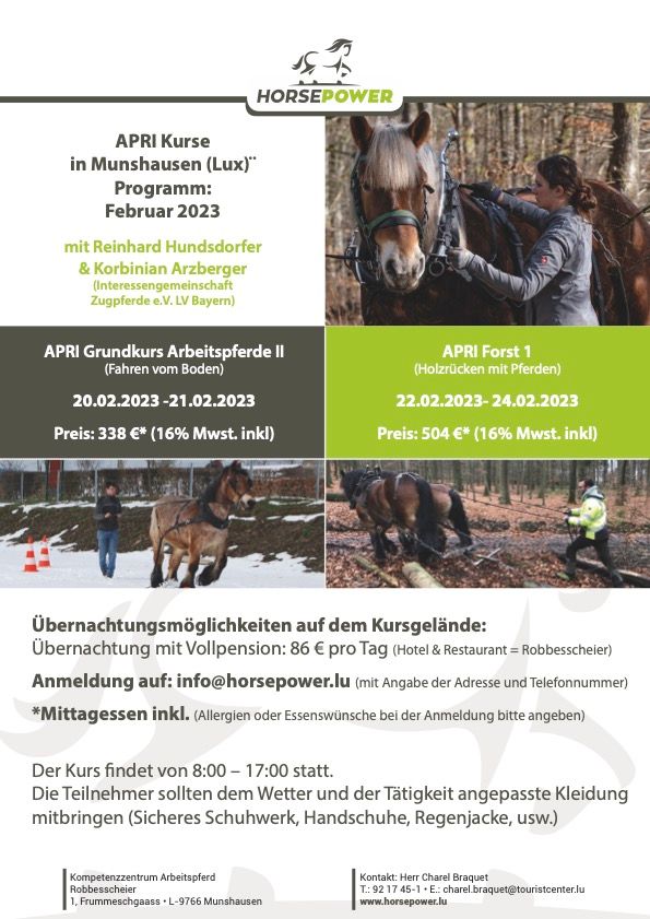 Dieser Kurs bietet einen Einstieg in den Umgang und die Arbeit mit Zugpferden vom Boden. Er vermittelt Grundlagen und bildet die verpflichtende Basis für die Teilnahme an den weiterführenden APRI-Kursen.