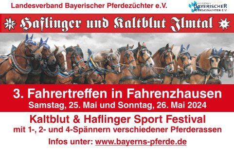 Kaltblut & Haflinger Sportfestival Am 25. und 26. Mai 2024 wird das Kaltblut und Haflinger Sportfestival im Rahmen des dritten Fahrertreffens in Fahrenzhausen wiederbelebt. Die Kaltblut und Haflinger Genossenschaft Ilmtal veranstaltet in Zusammenarbeit mit dem Landesverband Bayerischer Pferdezüchter e.V. Prüfungen für Ein-, Zwei- und Vierspänner für die Rassen Haflinger, Edelbluthaflinger, Kaltblut sowie sonstige Rassen. Bei der Mannschaftswertung treten die Teams der unterschiedlichen Genossenschaften im Hindernisfahren, Geschicklichkeitsparcours, Kutschen-Biathlon, Wettsägen und Schnapper-Wettbewerb gegeneinander an. Vorab wird am Samstagvormittag eine Orientierungsfahrt von ca. 13 km angeboten. Der Wettbewerb wird durch ein Schauprogramm und ein paar Ausstellern umrahmt. Auch für das leibliche Wohl der Teilnehmer und Zuschauer ist ausreichend gesorgt.
