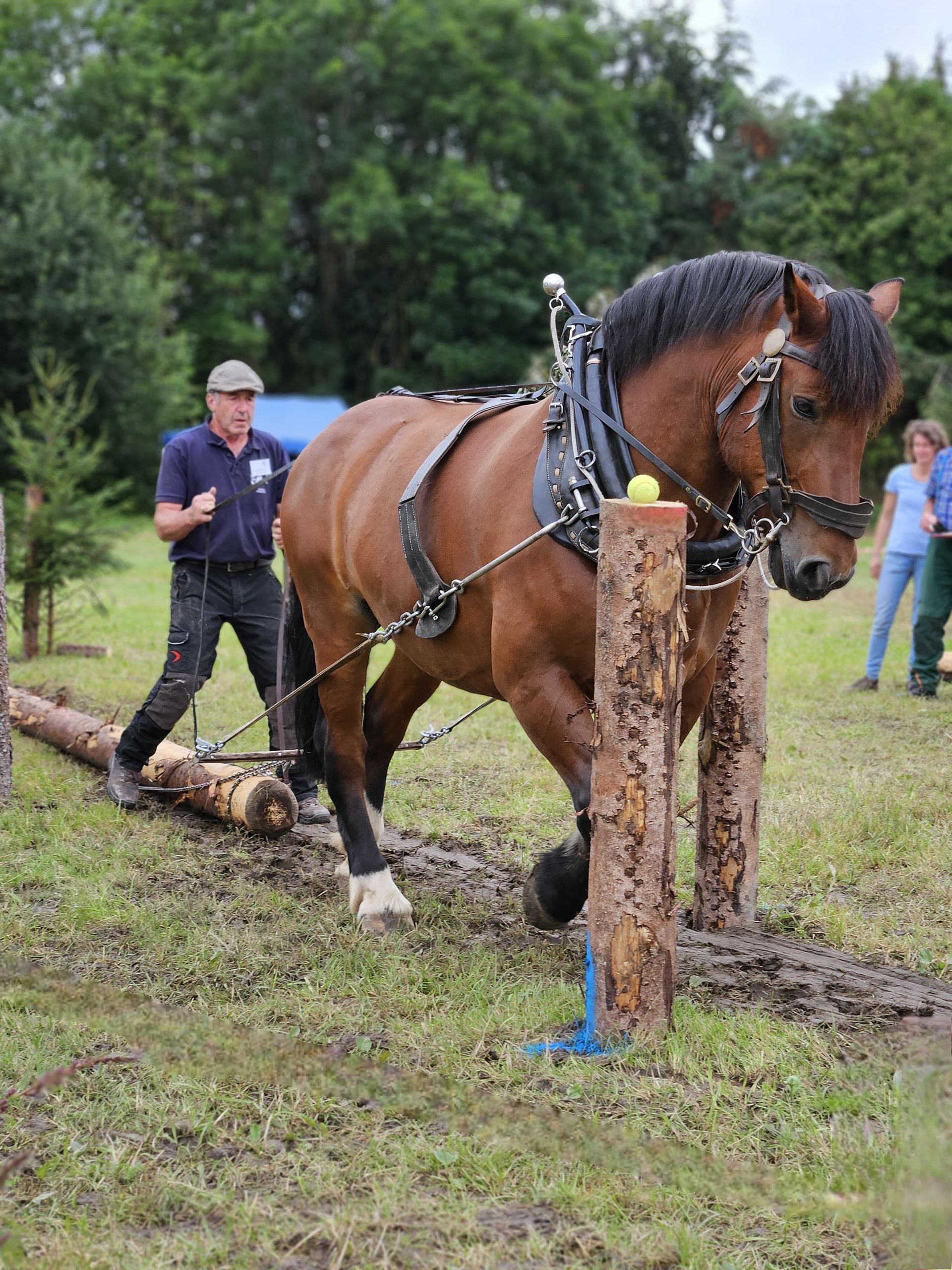 13. Offene Bayerische Meisterschaft in Bad Wörishofen Am 13. und 14.07.2024 fand auf der Anlage des Reit- und Fahrverbands Bad Wörishofen ein in gleich mehrfacher Hinsicht neuartiges Holzrücketurnier statt. Die Anlage im Ulla-Salzgeber-Weg bot für diesen sportlichen Wettkampf der IGZ-Bayern ideale Bedingungen und es entstand über die Tage eine produktive und sehr herzliche Zusammenarbeit der beiden Vereine. Ein großes Dankeschön hier besonders an Silke und Rudl Jakwerth. Der Parcours, hauptverantwortlich von Ronny Fleischer entworfen, wurde von den fleißigen Helfern aufgebaut. Unterstützung erhielten sie von den 7 Teilnehmern des parallel stattfindendem Richter- und Parcoursbau- Lehrgangs unter der Leitung von Markus Freyburger. Die Hindernisse waren, bis auf eine Ausnahme, sehr eng an reale Situationen aus der Praxis angelehnt, um das Geschick von Pferden und Fuhrleuten im Wald zu demonstrieren. Gleichzeitig wurde dieser Wettbewerb als Probelauf für das neu erarbeitete Regelwerk der Deutschen Holzrückemeisterschaft genutzt. Dieses sieht unter anderen eine Tierwohlwertung für jedes Hindernis vor. Die Geschirrkontrolle jedes Gespanns vor dem Start war ebenso eine Neuerung in Bayern. Auch hier bekamen die Kursteilnehmer intensive Einblicke in alle Abläufe. Ab Samstagvormittag starteten 32 Einspänner und 18 Zweispänner aus Deutschland und Österreich. Den Zuschauern wurde an beiden Tagen Pferdearbeit auf hohem Niveau präsentiert, waren doch auch einigen ehemalige und amtierende Europameister unter den Startern. Aus diesem Starterfeld kürten die beiden Hauptrichter Markus Freyburger und Matthias Buchmann schlussendlich am Sonntag spätnachmittags die Bayerischen Meister wie folgt: Bay. Meister Einspänner: Rummelsberger Alex mit Stella Vizemeister Einspänner: März Johann sen. mit Ute Bay. Meister Zweispänner: Rummelsberger Alex mit Stella und Simmerl Vizemeister Zweispänner: Hundsdorfer Reinhard mit Chuck und Norris Platzierte der offenen Wertung Einspänner: 1. Bruchhold Ines mit Carlos 2. Rummelsberger Alex mit Stella 3. Posautz Rene mit Flip Platzierte der offenen Wertung Zweispänner 1. Wöhr Richard mit Fritz und Holly 2. Pritzi Robert mit Rune und Seppi 3. Gulz Thomas mit Fritz und Holly Noch eine Neuerung war eine von Steffi Hundsdorfer entworfenen Wertungstabelle, die die Arbeit in der Meldestelle maßgeblich erleichterte. Diese wird im Nachgang zur Veranstaltung als Download auf www.ig-zugpferde.de zur Verfügung stehen. Ein großes Dankeschön für die vielen Stunden vor und während der Veranstaltung die Steffi hier investiert hat. Unser Sprecher Herbert Mayer aus Raisting Informierte das Publikum sehr fachkundig und unterhaltsam. Hierfür auch ein großes Dankeschön. Viele der rund 1200 Besucher aus Nah und Fern an diesem Wochenende blieben deswegen weit länger als ursprünglich geplant. Einer der wohl am weitesten angereisten Besucher war Charel Braque vom „Horse Power Project“ in Luxemburg. Dieser ist dem LV-Bayern durch diverse gemeinsame Projekte schon lange kein Unbekannter mehr und ein immer gern gesehener Gast. Die Grundvoraussetzung für diese gelungene Veranstaltung ist ein engagiertes und harmonisches Team. Der herzliche und wertschätzende Umgang miteinander war für Starter, Besucher, Lehrgangsteilnehmer und Helfer gleichwohl angenehm spürbar. Der LV-Bayern bedankt sich ausdrücklich bei allen die zu dem Gelingen dieses schönen Holzrücke Wochenendes beigetragen haben und Freud sich besonders über das Angebot des Reit- und Fahrverbands die Meisterschaft 2026 wieder in Bad Wörishofen auszutragen. T.Richter/M.Göbel